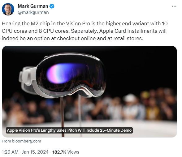 彭博社記者馬克·古爾曼表示,Apple Vision Pro采用的是配備了10個GPU核心和8個CPU核心的M2芯片,與蘋果高端MacBook Air使用的是同一芯片型號。