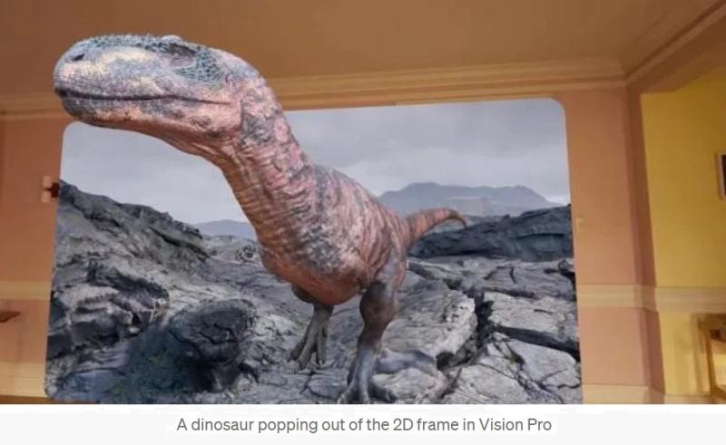屏幕上的部分可為立體,仍具有3D外觀。屏幕外內(nèi)容3D外觀可通過其在虛擬屏幕前面或之外的3D位置處的定位來確定。邊界可被突出顯示,例如,使房間中的恐龍走向觀看者。