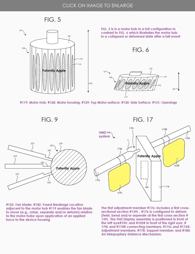 蘋果專利圖5為處于第一配置的電機(jī)輪轂示意圖,圖6為第二配置電機(jī)輪轂示意圖,Vision Pro意外跌落期間的變形配置。更具體說,蘋果指出,與圖1所示的第一種配置相比,#128 電機(jī)外殼處于變形配置(例如,壓扁或塌陷)。開口#131降低了電機(jī)外殼的整體結(jié)構(gòu)剛度,并使側(cè)表面#130以可逆方式變形,例如塌陷,或不可逆方式變形,例如擠壓。電機(jī)輪轂#119可從圖1所示的第一配置可逆或不可逆地變形。