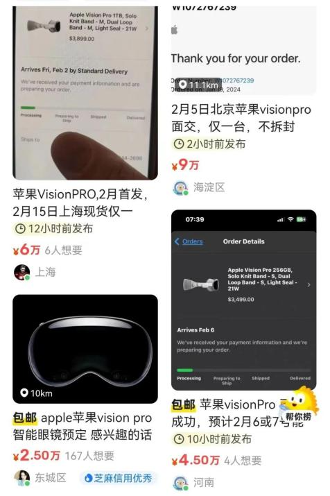 即便Vision Pro起售價高達3499美元(包括256GB、512GB、1TB三種存儲容量,定價分別為3499美元、3699美元、3899美元),同時僅限美國境內(nèi)發(fā)貨與線下提貨,然而依然無法阻擋全球果粉和極客們的熱情:預(yù)售開啟5分鐘,就擠爆了服務(wù)器;僅僅30分鐘后,發(fā)貨日期就變成5-6周!國內(nèi)一些黃牛渠道甚至將價格炒到9萬元的天價!