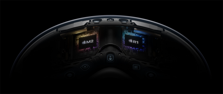 作為7年磨一劍的首款空間計算設(shè)備,除了設(shè)計、用料上處處彰顯蘋果對細節(jié)的極致標(biāo)準(zhǔn)之外,Vision Pro在硬件和性能參數(shù)上同樣是直接拉滿:雙自研芯片(M2+R1)、雙眼8K級超高解析度顯示系統(tǒng),以及12個攝像頭/5個傳感器。