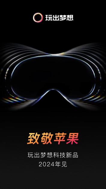 在海外巨頭動作頻繁的同時,國內(nèi)頭部XR品牌也是不甘示弱。玩出夢想科技于1月19日釋出「致敬蘋果」海報,宣布2024年將推出空間計算新品。據(jù)悉,該新品單眼分辨率4K,與Vision Pro一致,同時還有空間視頻、高清晰度彩色VST、輕辦公、巨幕觀影等功能。