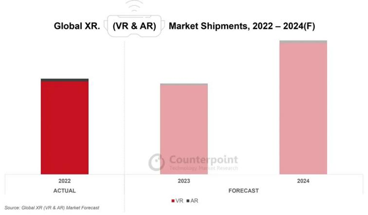 市場調(diào)查機構(gòu)CounterPoint最新的全球XR市場預(yù)測顯示,XR頭顯出貨量預(yù)計將在2024年增加390萬臺,實現(xiàn)兩位數(shù)的高同比增長,創(chuàng)下歷史高位。CounterPoint高級分析師Harmeet Singh Walia認(rèn)為,蘋果進入XR市場萬眾期待,將成為產(chǎn)業(yè)發(fā)展的分水嶺。