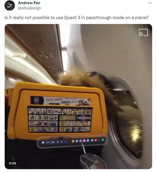 UX設(shè)計(jì)師Andrew Fox轉(zhuǎn)發(fā)了一段Facebook用戶Netsvietaiev Oleksandr嘗試在飛機(jī)上以直通模式使用Quest 3的視頻,視頻顯示,由于界面抖動(dòng)、偏離而無法使用。