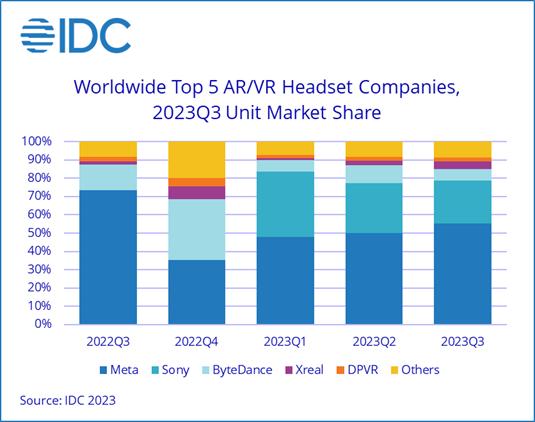 然而,2024年將成為AR/VR頭顯市場巨大復(fù)蘇的一年,AR/VR頭顯出貨量預(yù)計(jì)將增長46.4%?;謴?fù)狀態(tài)得益于Meta Quest 3和Apple Vision Pro的上市,預(yù)計(jì)這兩款產(chǎn)品將引起廣泛關(guān)注。Meta 是2023年第三季度的市場領(lǐng)導(dǎo)者,占據(jù)了55.2%的市場份額,在2023年前三個(gè)季度(Quest 3推出之前)的出貨量已經(jīng)超過預(yù)期的10倍,并且2024年可能會經(jīng)歷同比增長。