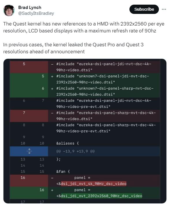 Lynch強(qiáng)調(diào),在Quest Pro和Quest 3發(fā)布之前,這兩款頭顯的分辨率也在類似的內(nèi)核中被發(fā)現(xiàn)并泄露。