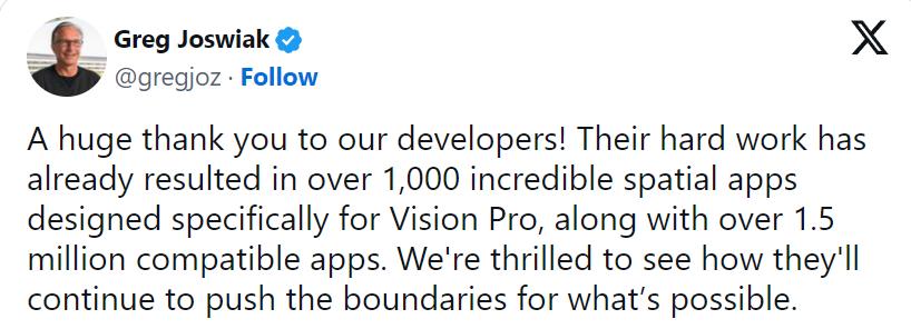 蘋果營銷主管Greg Joswiak表示,Apple Vision Pro擁有超1000多款應用,超150萬款iPad應用與Vision Pro兼容并且能夠在該設備上運行。