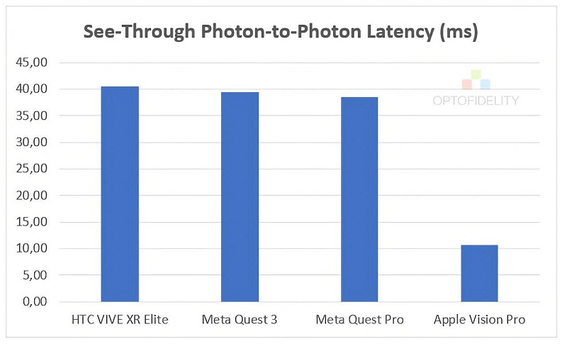 其中,三款非蘋果頭顯的透傳時(shí)間約為40毫秒,而Vision Pro的透傳時(shí)間為11毫秒。