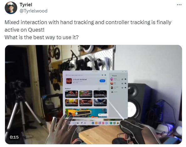 用戶可以一只手使用手柄,另一只手進行手部跟蹤,從而實現(xiàn)兩全其美控制:手柄提供精確度和觸覺反饋,手部跟蹤提供沉浸感;