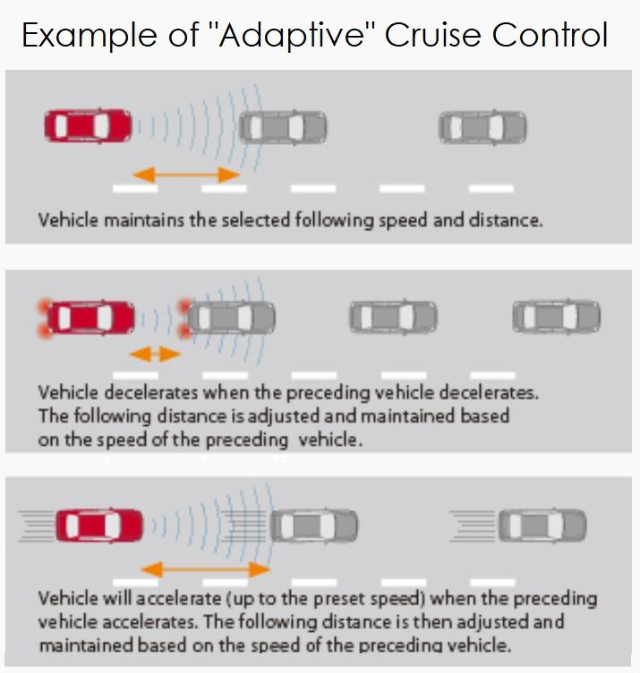 傳統(tǒng)的巡航控制通常保持固定的速度,自適應(yīng)巡航控制通常根據(jù)交通狀況(例如前車的速度)自動調(diào)整速度。