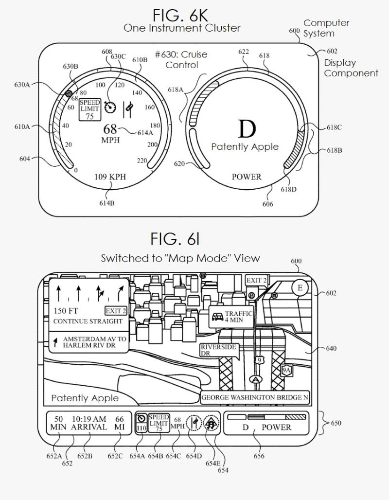 專利圖顯示,在啟用巡航控制的情況下,車速已達(dá)到68英里/小時的巡航控制速度。計算機系統(tǒng)#600接收請求進(jìn)入地圖模式的用戶輸入;在一些實施例中,計算機系統(tǒng)正在導(dǎo)航到目的地并且進(jìn)入地圖模式的請求為顯示到目的地的導(dǎo)航指令的請求。