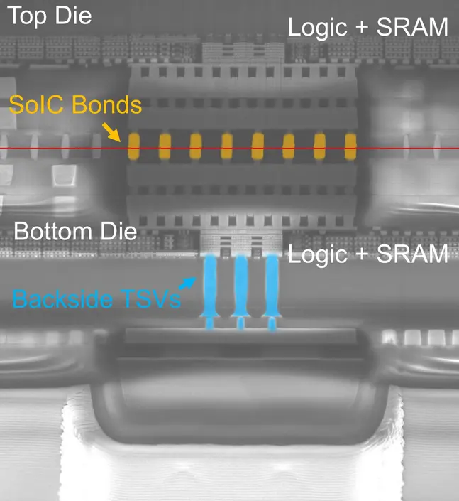 臺積電SoIC高級封裝技術(shù)可實現(xiàn)2μm的凸塊間距。雖然Meta的原型芯片并未發(fā)揮SoIC技術(shù)的全部潛力,但兩層芯片中間仍存在33000個信號連接和600萬個電源連接;此外,在下部芯片底部,采用了TSV硅通孔實現(xiàn)電力輸入和信號傳出。