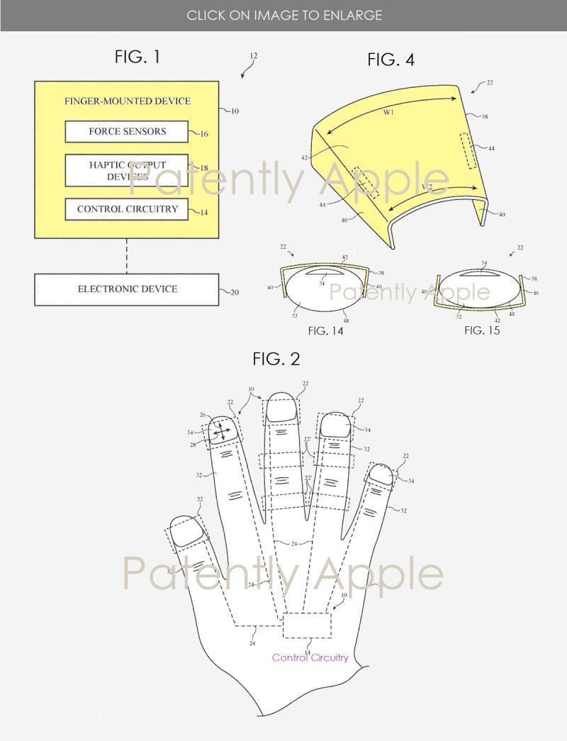 蘋果專利涵蓋了一種手指安裝設備,該設備包括與控制電路耦合的手指安裝單元??刂齐娐穼⑹种赴惭b單元收集的信息無線傳輸?shù)酵獠吭O備以控制外部設備;控制電路基于手指安裝單元來向用戶的手指提供諸如觸感反饋之類的反饋。