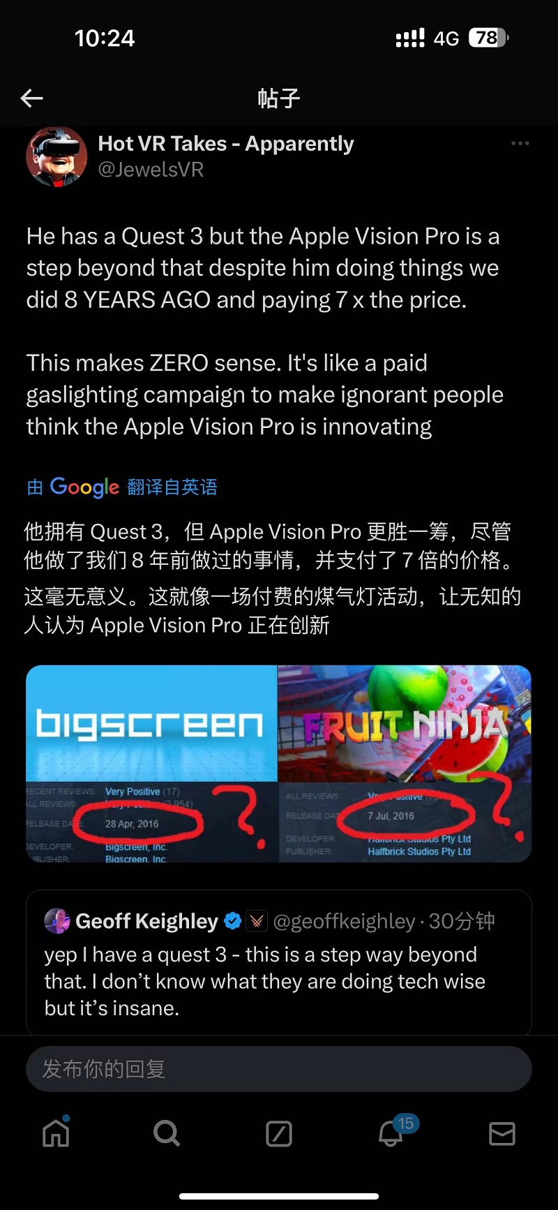 但僅僅從這些公布的Vision Pro原生應(yīng)用陣容(而非兼容應(yīng)用)來(lái)看,Vision Pro原生3D內(nèi)容生態(tài)的吸引力還不夠抵消其昂貴的售價(jià)。有一些意見較為激進(jìn)的人士甚至認(rèn)為,Vision Pro只不過(guò)是做了8年前VR已經(jīng)做過(guò)的事情——大屏觀影應(yīng)用BigScreen和VR版水果忍者在2016年就已經(jīng)登錄了Steam。