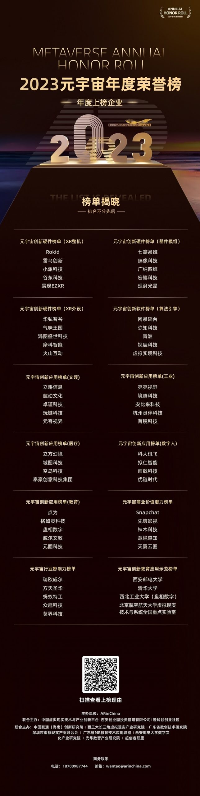 本屆榜單旨在表彰和激勵(lì)相關(guān)企業(yè)積極投身于元宇宙的創(chuàng)新與發(fā)展,推動(dòng)整個(gè)行業(yè)的進(jìn)步與繁榮。經(jīng)過榜單評(píng)審組委會(huì)的慎重評(píng)選,最終遴選出57家在元宇宙領(lǐng)域擁有出色解決方案和做出突出貢獻(xiàn)的企業(yè)和單位。以下為“2023元宇宙年度榮譽(yù)榜”完整榜單,掃碼可查看上榜理由。