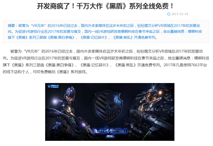 臨近年末,各大VR廠商都開始回首元年展望未來,整個(gè)市場(chǎng)也都趨于平和。然而,國內(nèi)知名的VR游戲研發(fā)商喂啊科技突然在這個(gè)時(shí)間節(jié)點(diǎn)上宣布其旗下產(chǎn)品《黑盾》系列三部曲將免費(fèi)開放的消息,這突如其來的一步怪棋讓整個(gè)市場(chǎng)陷入一片嘩然,《黑盾》系列的免費(fèi)開放意味著它將打破國內(nèi)主流VR大作采用代理平臺(tái)按啟動(dòng)次數(shù)收費(fèi)或一次性付費(fèi)下載的收費(fèi)方式,雖然《黑盾》創(chuàng)始人陳修超表示此舉只是想降低VR門檻推動(dòng)VR行業(yè)發(fā)展,但這個(gè)看似自殺性的舉動(dòng)似乎并沒有這么簡(jiǎn)單,那么這款擁有數(shù)千萬投資制作而成的VR大作突然選擇免費(fèi)開放,到底是圖什么呢?