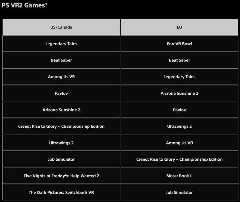 2月,「Beat Saber」Meta這款節(jié)奏熱門音游在以上銷售地區(qū)都降到了第二名,「Among Us VR」在北美市場則排名第三。另外,「Arizona Sunshine 2」、「Ultrawings 2」、「Pavlov」(2023年下載次數(shù)最多的PS VR2游戲)等熱門游戲也在榜單,具體如下: