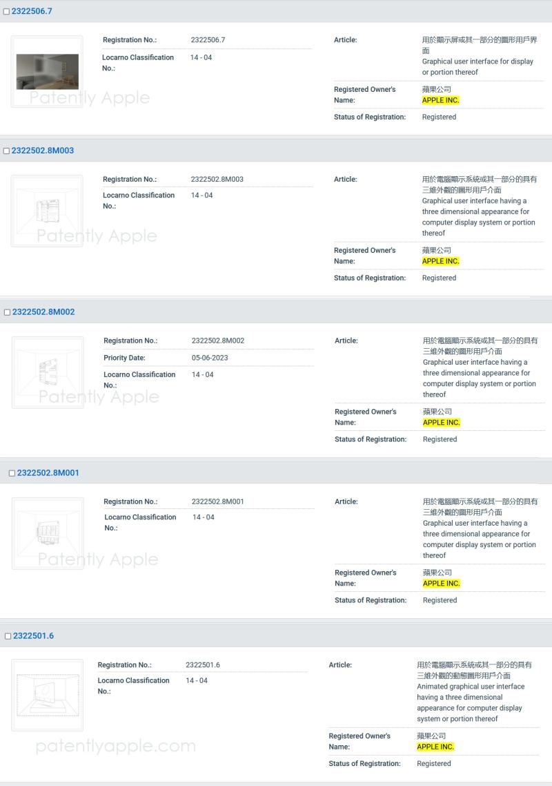 香港知識(shí)產(chǎn)權(quán)署正式授予蘋果五項(xiàng)與visionOS相關(guān)的新設(shè)計(jì)專利。專利描述指出:“具有三維外觀的圖形用戶界面,用于計(jì)算機(jī)顯示系統(tǒng)的一部分?!?,所有五種設(shè)計(jì)均按照洛迦諾分類 14-04提交,涵蓋“屏幕顯示和圖標(biāo)”。該課程中包含#102429,涵蓋“圖形用戶界面(計(jì)算機(jī)屏幕布局)”。