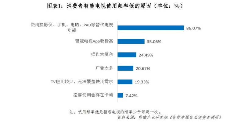 此外,電視市場還面臨著開機率低的另一困境。前瞻產業(yè)研究院的《2024年中國智能電視交互新趨勢報告》顯示,電視開機率低最重要的因素,是投影儀、手機、電腦、Pad等產品正在替代電視的功能。