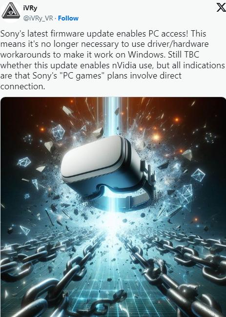 iVRy(一個(gè)長(zhǎng)期致力于面向PS VR2開發(fā)非官方PC VR支持的團(tuán)隊(duì))稱,此更新將不再需要任何硬件(如PS5)或驅(qū)動(dòng)程序解決方法,PS VR2便能通過(guò)電纜簡(jiǎn)單連接PC。