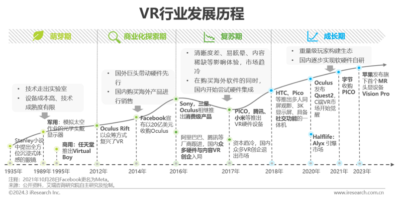 虛擬現(xiàn)實概念源于科幻小說,由任天堂等游戲廠商開啟商業(yè)化之路。早期設(shè)備成本高,技術(shù)成熟度有限,游戲廠商的嘗試都宣告失敗。2016年是虛擬現(xiàn)實的元年,硬件巨頭消費(fèi)級產(chǎn)品的推出,疊加中國眾多VR創(chuàng)企大力進(jìn)軍硬件端與內(nèi)容端,短期市場呈爆炸式增長。但行業(yè)整體處于民用初期,受內(nèi)容稀缺、設(shè)備易眩暈、屏幕清晰度差等影響,消費(fèi)級市場整體發(fā)展放緩。伴隨行業(yè)技術(shù)日趨成熟與產(chǎn)業(yè)玩家的擴(kuò)容,行業(yè)在2020-2022年邁入發(fā)展的關(guān)鍵階段,Quest銷量迎消費(fèi)級拐點。2023年蘋果Vision Pro發(fā)布,其對全新交互方式的實踐為業(yè)內(nèi)玩家?guī)硇碌乃伎肌W鳛楝F(xiàn)階段頂配產(chǎn)品,Vision Pro的出現(xiàn)不僅極大拉動虛擬現(xiàn)實產(chǎn)業(yè)玩家信心,同時在市場激起的“浪花”,為行業(yè)帶來更多關(guān)注。艾瑞認(rèn)為,在可預(yù)見的27~28年,蘋果二代甚至三代產(chǎn)品將貢獻(xiàn)下一個里程碑,為產(chǎn)業(yè)帶來新的爆發(fā)。