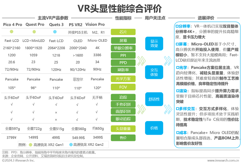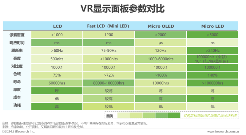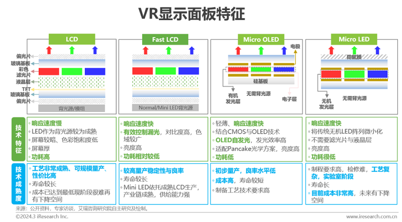 早期VR頭顯大部分采用LCD,礙于LCD響應(yīng)速度慢,從2016年起,玻璃基OLED被嘗試應(yīng)用于VR設(shè)備中。當(dāng)前的VR設(shè)備主要采用Fast LCD屏幕,該類型顯示屏在響應(yīng)速度、量產(chǎn)穩(wěn)定性、良率與成本等方面均有所改善。伴隨顯示方案的步步迭代,2022年起,VR產(chǎn)業(yè)頭部企業(yè)開始研發(fā)帶有Mini LED的Fast LCD顯示面板與Micro OLED面板,以求在對比度、刷新率、亮度、光效等方面獲得進(jìn)一步提升。顯示屏亮度與對比度的提升,更好的適配了Pancake光學(xué)方案對高亮度的需求。值得一提的是,相較于Micro OLED的性能優(yōu)勢,Micro LED在屏幕輕薄度、光效、顯示性能等方案更為出色,目前以蘋果、三星為首的企業(yè)正積極布局,是未來VR顯示面板的理想選擇。