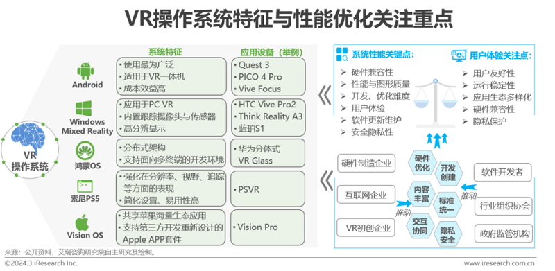 底層的VR操作系統(tǒng)處于虛擬現(xiàn)實應(yīng)用程序與硬件之間,承擔(dān)管理硬件資源、提供驅(qū)動程序支持、處理輸入與輸出,協(xié)調(diào)傳感器數(shù)據(jù)等任務(wù)。早期的VR一體機(jī)基本沿襲了手機(jī)端的計算芯片與操作系統(tǒng),目前依舊以安卓系統(tǒng)為主,包括部分品牌機(jī)型的深度定制的UI。安卓系統(tǒng)為開源屬性,擁有龐大的開發(fā)者支持,具備跨平臺兼容性;利用安卓的現(xiàn)成基礎(chǔ),廠商可以自行定制修改,快速推出VR新品。雖然安卓在業(yè)內(nèi)占據(jù)主導(dǎo)地位,但有部分制造商選擇開發(fā)自己的專有系統(tǒng),以滿足特定需求或為產(chǎn)品提供差異化屬性。目前,分體式的VR設(shè)備,包括PC VR、PSVR和華為VR Glass超短焦手機(jī)VR,操作系統(tǒng)以主機(jī)為主,同時涉及Windows MR、索尼PS和華為鴻蒙OS。蘋果Vison Pro搭載的Vision OS是一款VR/AR操作系統(tǒng),旨在提供沉浸式、交互性強(qiáng)的虛擬體驗。Vision OS可兼容iphone和ipad數(shù)十萬款應(yīng)用,并內(nèi)嵌了iOS和空間計算框架、空間音頻引擎、注視點渲染引擎等?;诙嗄赀\(yùn)營的生態(tài)優(yōu)勢,蘋果可擴(kuò)速擴(kuò)張Vision OS,搭建圍繞Vision OS的內(nèi)容與開發(fā)者生態(tài),對整個XR行業(yè)起拉動作用。