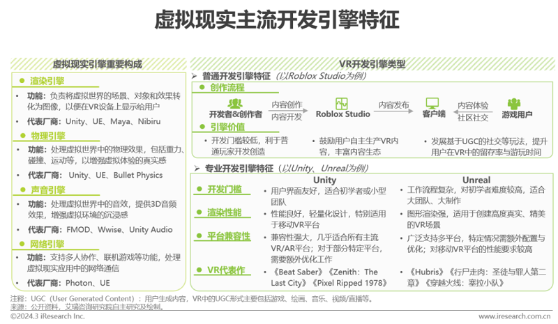 引擎平臺將軟件系統(tǒng)分解為若干功能模塊,以此來提高軟件開發(fā)效率、降低開發(fā)成本并增強(qiáng)軟件系統(tǒng)的可拓展性。VR產(chǎn)品強(qiáng)調(diào)交互體驗,開發(fā)前期需要實驗驗證,確保核心設(shè)計點符合VR場景。目前應(yīng)用于VR的開發(fā)引擎以Unity和Unreal為主,在物理模型創(chuàng)建、圖像渲染、系統(tǒng)渲染等方面具備良好性能,因為該類型開發(fā)引擎具備一定使用難度,主要供程序員、開發(fā)者等專業(yè)人員使用。近兩年來VR行業(yè)玩家均在積極推進(jìn)內(nèi)容生態(tài)的構(gòu)建,加之元宇宙產(chǎn)業(yè)的迅速發(fā)展和AIGC刮起的新一輪科技熱潮,企業(yè)鼓勵普通用戶自主生產(chǎn)內(nèi)容,并提供開發(fā)門檻較低的創(chuàng)作工具,激發(fā)玩家進(jìn)行UGC創(chuàng)作,同步強(qiáng)化內(nèi)容與社交生態(tài)。