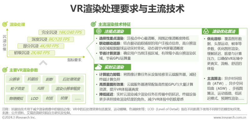 渲染處理主要涉及(1)內(nèi)容渲染:在VR環(huán)境中創(chuàng)建、生成各種元素、場景、對象與效果和(2)終端渲染:對生成的內(nèi)容進(jìn)行畸變、色散等校正并呈現(xiàn)到用戶終端設(shè)備。為匹配用戶的進(jìn)階需求,當(dāng)前的VR渲染處理已跨越初級階段向部分沉浸階段邁進(jìn),在畫質(zhì)、速度、成本等多方面尋求質(zhì)量與效率間的平衡。相較于普通的3D渲染,VR渲染注重用戶體驗的全方位性,在幀率、延遲、交互控制、立體聲視圖、性能優(yōu)化等方面均有更高要求。作為連接用戶與虛擬環(huán)境的橋梁,渲染在VR中扮演重要角色,需要高規(guī)格硬件算力設(shè)備、成熟的XR可穿戴智能終端、優(yōu)化的渲染算法及逐步系統(tǒng)化的云渲染模式等技術(shù)的協(xié)同推動。當(dāng)前階段,得益于眼動追蹤技術(shù)的成熟,注視點渲染吸引更多業(yè)內(nèi)玩家嘗試,如Quest Pro、PS VR 2、PICO 4 Pro等越來越多的VR設(shè)備已在產(chǎn)品中配置。AI算法的成熟應(yīng)用,為渲染模型提供大量圖像、視頻數(shù)據(jù),VR場景質(zhì)量更為逼真。云化架構(gòu)將渲染能力導(dǎo)入云端,云邊協(xié)同有助于降低終端配置成本,改善時延、抖動等問題。在硬件算力仍有不足的情況下,ATW、ASW等優(yōu)化算法也成為VR產(chǎn)品標(biāo)配,以降低虛擬世界的渲染復(fù)雜性,進(jìn)而緩解延遲與滯后。