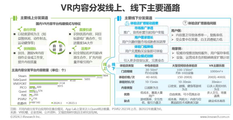 內(nèi)容分發(fā)平臺打破內(nèi)容碎片化,聚合的豐富內(nèi)容可匹配用戶不同興趣與需求。內(nèi)容分發(fā)渠道分為:(1)線上:由內(nèi)容分發(fā)平臺主導(dǎo),為用戶提供在線購買、下載和體驗服務(wù)。目前線上分發(fā)渠道以各硬件廠商自行搭建為主,暫未出現(xiàn)第三方內(nèi)容分發(fā)平臺布局。從內(nèi)容數(shù)量角度,國外平臺占主導(dǎo)地位,其中Steam作為傳統(tǒng)游戲平臺,憑借多年積累優(yōu)勢,VR內(nèi)容數(shù)量一路領(lǐng)跑;國內(nèi)VR應(yīng)用商店加速追趕,盡管內(nèi)容體量仍無法同海外頭部廠商抗衡,但通過自研與引進(jìn)兩種模式,內(nèi)容量快速擴(kuò)充。數(shù)量并非絕對標(biāo)志,但多樣選擇為呈現(xiàn)優(yōu)質(zhì)內(nèi)容提供更大可能。(2)線下:多指B to C線下游藝門店,以VR體驗店為主。伴隨疫情開放,線下娛樂由停滯狀態(tài)開始不斷回溫,逐漸受到更多關(guān)注;如能有效緩解用戶與商家側(cè)面臨問題,VR體驗店有望成為VR產(chǎn)品出貨的重要支撐。