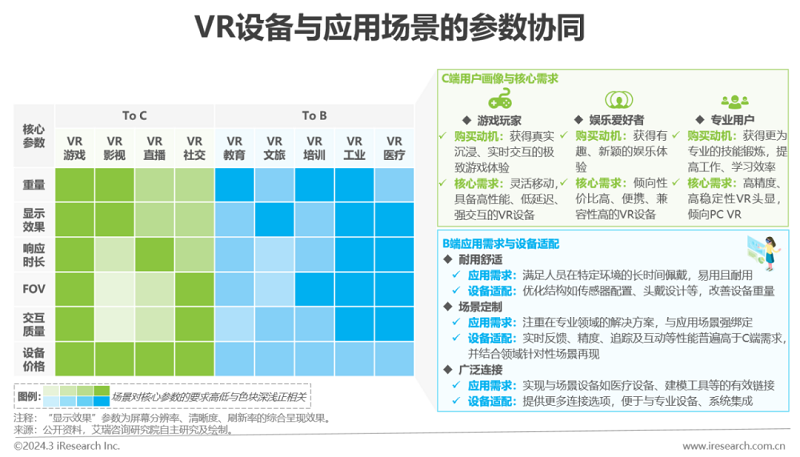 對于消費(fèi)級領(lǐng)域,游戲是VR在C端落地最早且相對成熟的場景,VR游戲用戶的行業(yè)教育程度最深,導(dǎo)致其對VR產(chǎn)品及服務(wù)的敏感性增強(qiáng)。行業(yè)后續(xù)衍生的C端場景中,直播、社交等聚焦動態(tài)與實時交互的細(xì)分應(yīng)用對響應(yīng)時長、交互質(zhì)量更為關(guān)注。VR影視更多依賴預(yù)先開發(fā)內(nèi)容,應(yīng)用重點在于展示。對于行業(yè)級領(lǐng)域,工業(yè)、醫(yī)療等技術(shù)門檻高的場景較為關(guān)注VR設(shè)備的可操作性,因而與應(yīng)用效果直接關(guān)聯(lián)的各項參數(shù),均為該場景的關(guān)注重點。在教育、培訓(xùn)等場景,VR技術(shù)與產(chǎn)品的應(yīng)用價值多體現(xiàn)為對行業(yè)工作模式的創(chuàng)新改革,領(lǐng)域用戶對VR技術(shù)、服務(wù)性能容忍度更高。