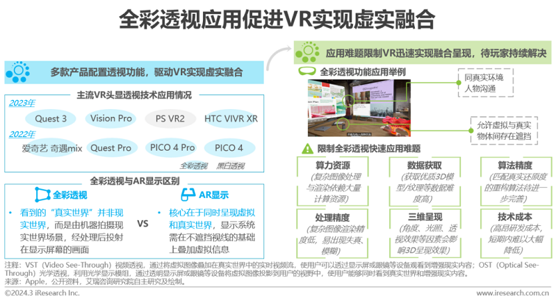 Quest 3打開了MR的大門,Vision Pro的發(fā)布開啟了MR時代。透視技術(shù)是MR的核心,其中,AR眼鏡多采用OST方案,VST則更適合當(dāng)前主流的VR產(chǎn)品形態(tài)。自2022年起,業(yè)內(nèi)已有玩家開始在VR中引入透視功能,Vision Pro對VST的采用,將引導(dǎo)更多廠商對VR設(shè)備配置透視功能。VR注重用戶的沉浸感,因此傳統(tǒng)設(shè)備強(qiáng)調(diào)與真實世界的完全脫離;但若期望VR設(shè)備可以完全融入用戶日常工作生活,同真實世界的正常交流不可避免。目前,VST已歷經(jīng)黑白透視、單目彩色方案邁入全彩透視階段,全彩透視功能的實現(xiàn)促進(jìn)虛擬現(xiàn)實體驗向虛實融合邁進(jìn),用戶可在虛擬環(huán)境中同現(xiàn)實世界產(chǎn)生交互。短期內(nèi)彩色透視技術(shù)的普及應(yīng)用仍然受限于多種因素,特別是來自算力資源、算法精度、技術(shù)成本等方面的壓力,有待行業(yè)玩家,特別是頭部企業(yè)持續(xù)實踐推進(jìn)。