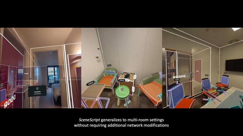 該捕獲輸出模式為一個英語文本文件,采用結(jié)構(gòu)化標(biāo)記代碼格式化,并包含目標(biāo)對象的尺寸。這些數(shù)據(jù)足以勾勒出目標(biāo)對象的輪廓或使用邊界框創(chuàng)建3D渲染。基于Meta Quest 3運行SceneScript軟件,研究人員可通過直通視圖來顯示重疊的點云數(shù)據(jù)和標(biāo)記的場景元素。最令人印象深刻的是,SceneScript還可以創(chuàng)建更復(fù)雜的幾何形狀,使桌子、辦公椅和沙發(fā)顯示更多細節(jié)。