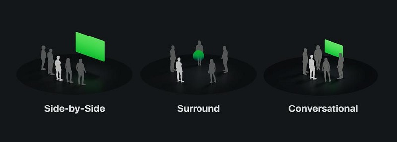 “空間數(shù)字角色”將使用戶能夠在AR和完全沉浸式應用中與其他Vision Pro用戶共享環(huán)境,通過共享坐標空間看到彼此,蘋果表示將為開發(fā)者提供三種“空間數(shù)字角色”定位模板:Side-By-Side、Surround和Conversational。