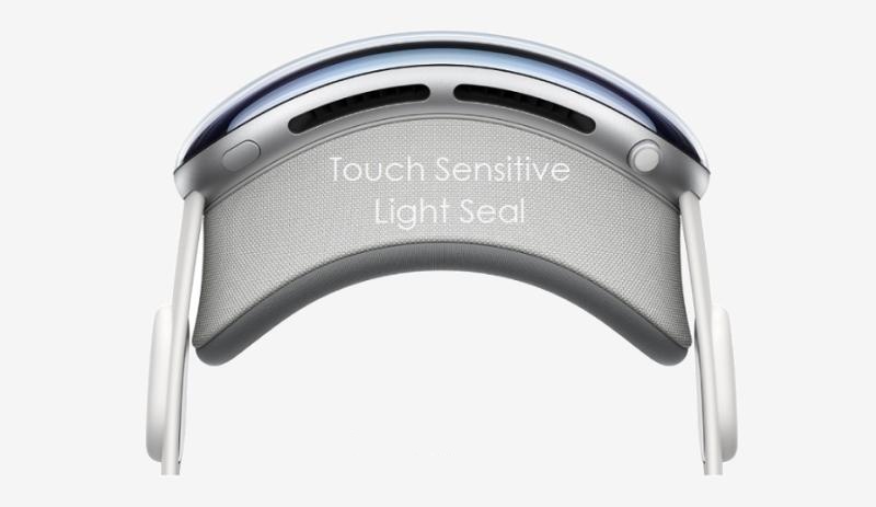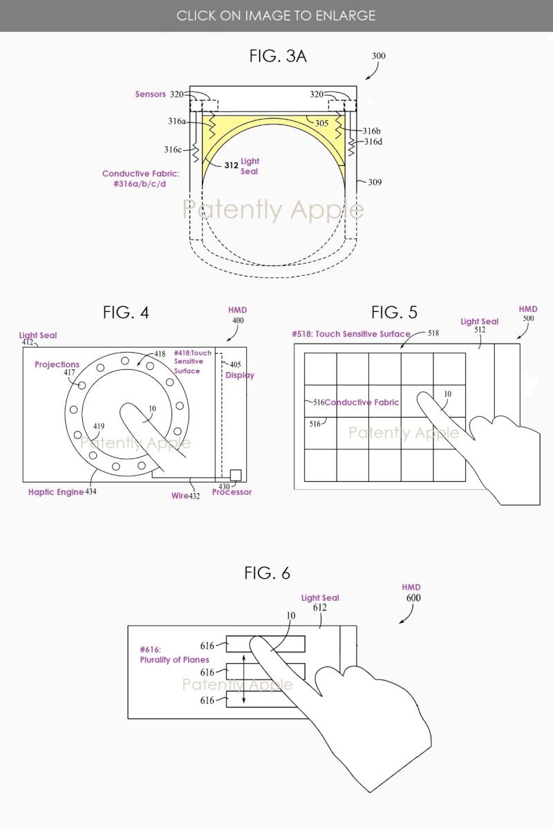 蘋果專利圖3A示出了頭戴式設備光密封件中具有導電織物的可頭戴設備俯視圖;圖4、圖5和圖6示出了頭戴式設備的光密封件的觸敏表面。