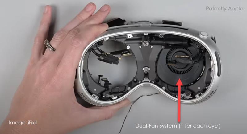 上圖展示了iFixit拆解拍攝的Vision Pro靜音雙風(fēng)扇系統(tǒng)。蘋果專利指出,Vision Pro可提供沉浸式或自然的用戶體驗(yàn),因此用戶可輕松專注于享受體驗(yàn),而不會(huì)被頭戴式設(shè)備機(jī)制分散注意力。Vision Pro組件在運(yùn)行過程中可能會(huì)產(chǎn)生熱量,長(zhǎng)時(shí)間過熱可能會(huì)損壞頭戴式設(shè)備的組件并導(dǎo)致用戶不適。通過多種方式減輕熱量,包括使用集成到頭戴式設(shè)備中的主動(dòng)機(jī)構(gòu)(例如,風(fēng)扇、鼓風(fēng)機(jī)等)。為了在小外形尺寸內(nèi)有效散熱,有時(shí)會(huì)使用主動(dòng)冷卻,主動(dòng)冷卻是指通過強(qiáng)制對(duì)流散發(fā)熱量的熱架構(gòu)。