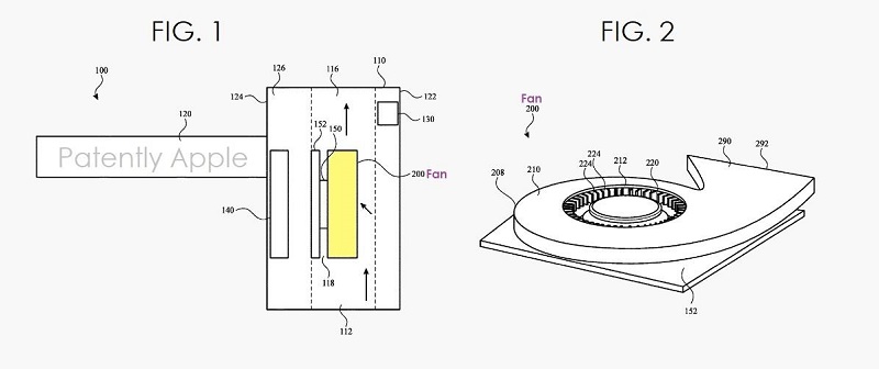 蘋果專利描述的系統(tǒng)可提供減輕顆粒和其他碎片侵入的風(fēng)扇,該風(fēng)扇包括一個(gè)突出物,形成一條曲折的路徑,引導(dǎo)進(jìn)入的顆粒遠(yuǎn)離敏感區(qū)域。風(fēng)扇包括顆粒離開風(fēng)扇的開口,風(fēng)扇包括固定部件(風(fēng)扇殼體)和運(yùn)動(dòng)部件(轉(zhuǎn)子、葉輪等)之間的可變間距,以避免顆粒的聚集。風(fēng)扇包括一個(gè)粘合墊,用于將顆粒收集并保留在不干擾葉輪運(yùn)行的位置。
