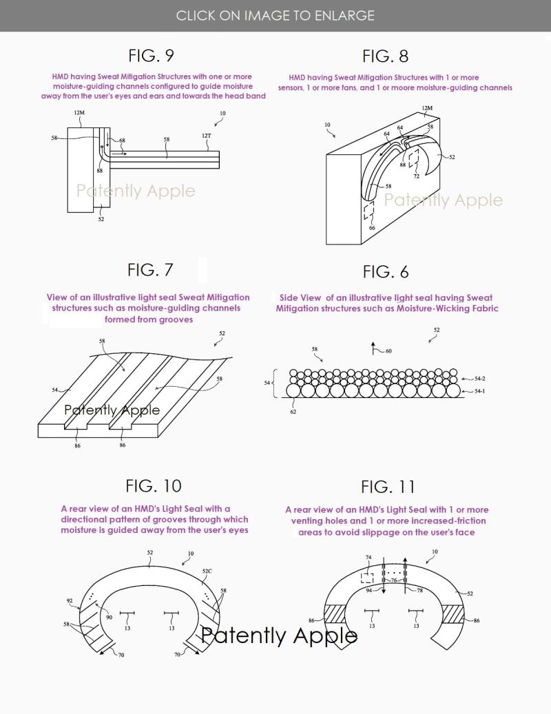 另外,為了讓Vision Pro用戶保持涼爽體驗(yàn),蘋果還發(fā)明了緩解汗水的裝置。專利指出,頭戴式設(shè)備可包括主外殼部分和主外殼部分中向eye boxes提供圖像的顯示器;光密封件可以耦合到主殼體部分并至少部分圍繞eye boxes;頭戴式設(shè)備可包括汗液緩解結(jié)構(gòu),例如光密封件中的水分引導(dǎo)通道,以引導(dǎo)汗液和其他水分遠(yuǎn)離eye boxes。