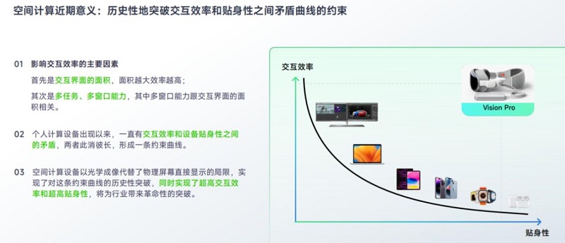 蘋果推出的Vision Pro,以光學(xué)成像代替了物理的屏幕直接顯示,并且基于強(qiáng)大的底層算力實現(xiàn)了多任務(wù)和多窗口顯示,從而實現(xiàn)了對這條曲線的歷史性突破,第一次同時實現(xiàn)了超高的交互效率和超高的貼身性。