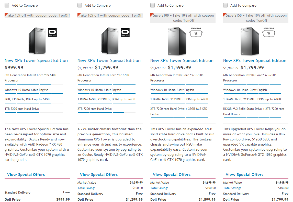 最后不得不提,官方并未提供隨機(jī)顯示器,也就是說VR玩家需要單獨(dú)配置。XPS Tower Special版本起價(jià)1000美元,最高配置版本起價(jià)為1800美元,如果在搭配上顯示器其售價(jià)還是非常高的。