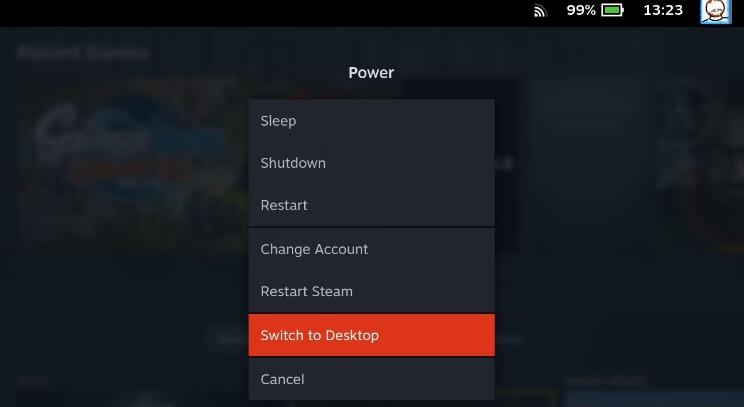 1. 按下Steam按鈕并找到電源選項,然后選擇切換到桌面模式。