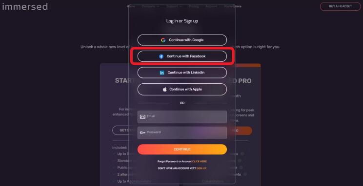 4.當(dāng)Immersed網(wǎng)站打開時,單擊“賬戶”注冊。我們建議使用Facebook賬戶登錄,因為你將可以通過Meta頭顯使用。