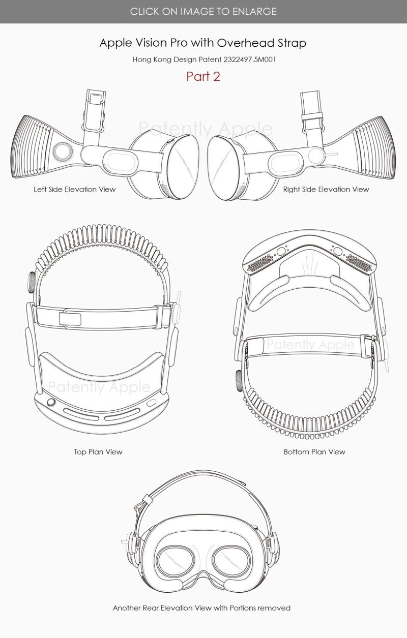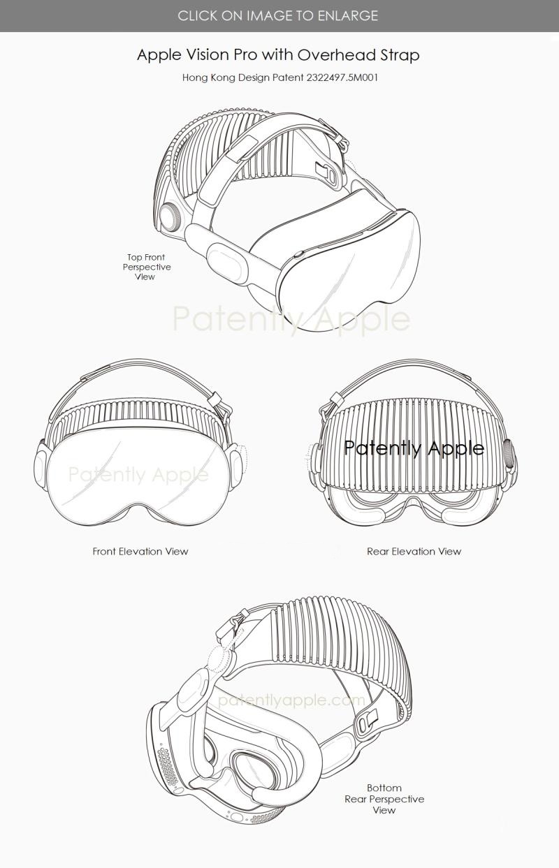 蘋果在香港獲得了與帶頭帶Vision Pro相關(guān)的設(shè)計(jì)專利。下面列出了與專利#2322497.5M001相關(guān)的兩組設(shè)計(jì)專利圖,其中完整展示了設(shè)計(jì)(CAD)外形;其他三項(xiàng)以后綴.5M002-04結(jié)尾的設(shè)計(jì)專利,涵蓋原始5M001設(shè)計(jì)的部分內(nèi)容。