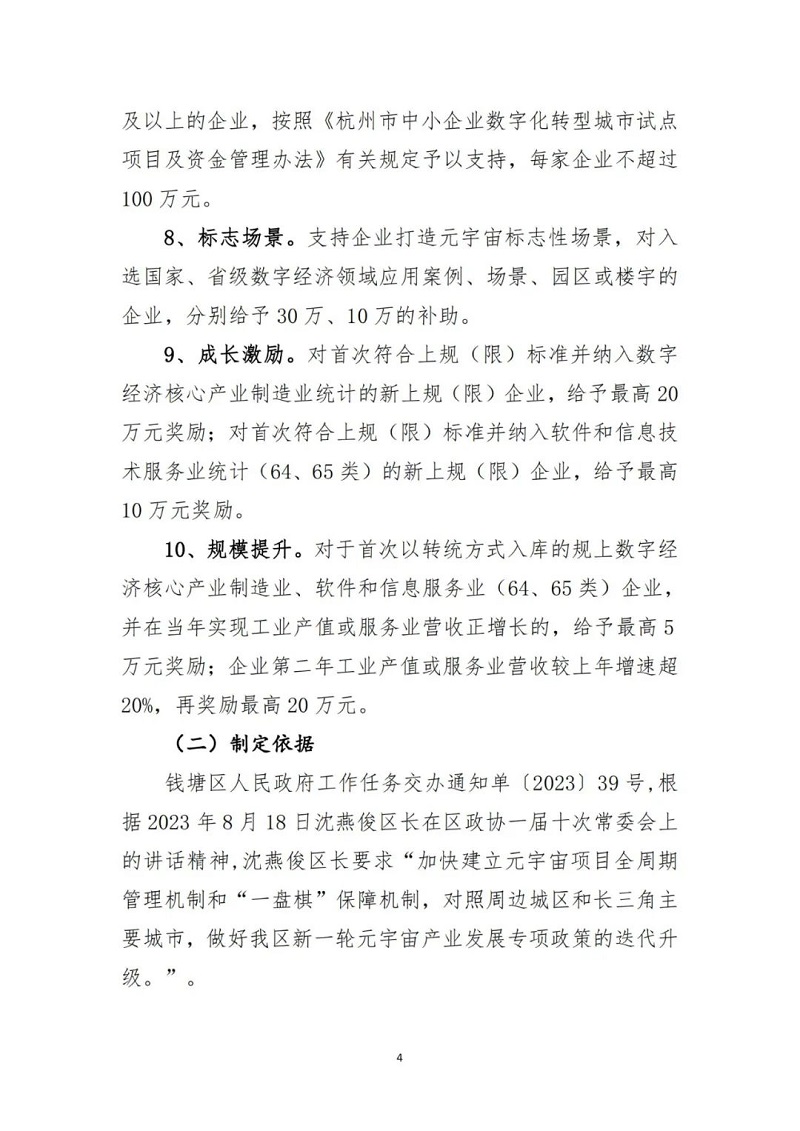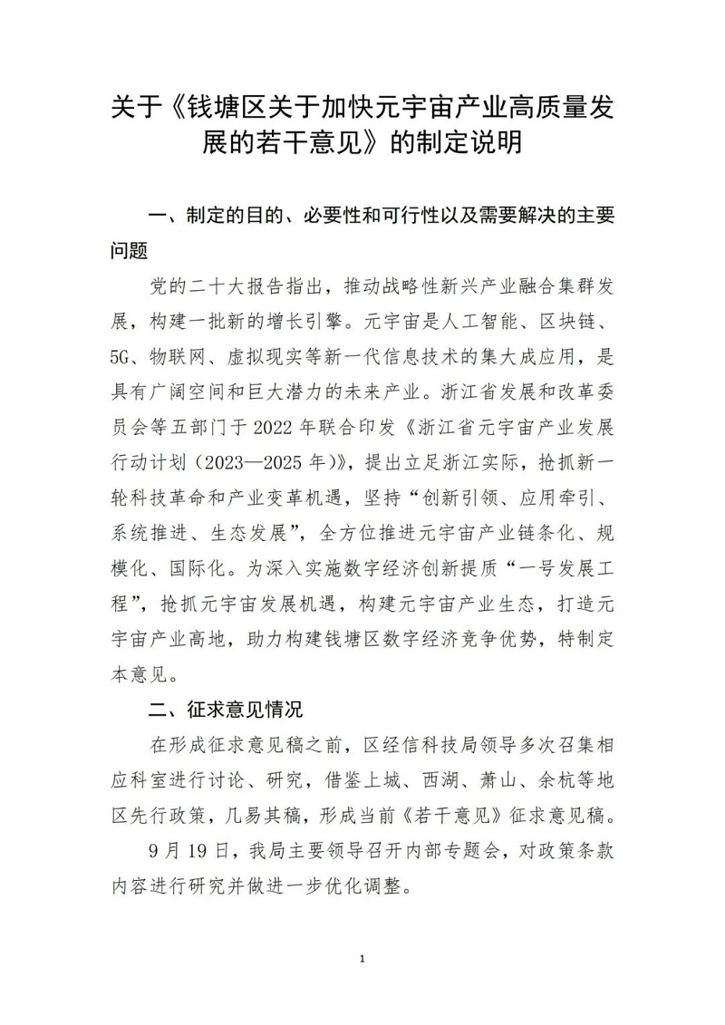 為深入實施數(shù)字經(jīng)濟創(chuàng)新提質(zhì)“一號發(fā)展工程”,搶抓元宇宙發(fā)展機遇,構(gòu)建元宇宙產(chǎn)業(yè)生態(tài),打造元宇宙產(chǎn)業(yè)高地,助力構(gòu)建杭州錢塘區(qū)數(shù)字經(jīng)濟競爭優(yōu)勢,根據(jù)錢塘區(qū)實際,特制定《錢塘區(qū)關(guān)于加快元宇宙產(chǎn)業(yè)高質(zhì)量發(fā)展的若干意見》(意見征求稿)?,F(xiàn)公開向社會征求意見,如有意見建議,請于4月19日前反饋。公示期限:2024年4月8日至4月19日。