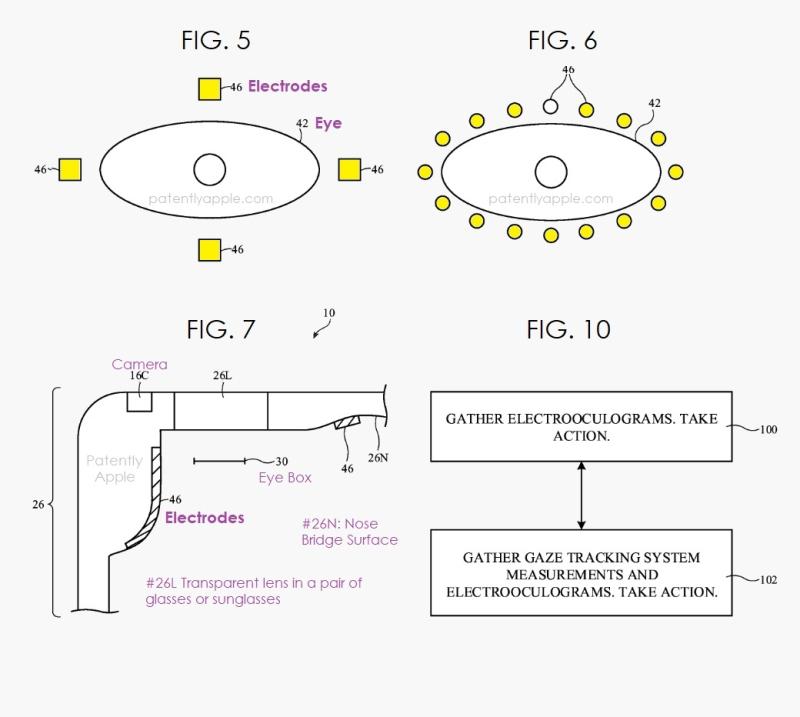 蘋果專利圖5和圖6為眼睛前視圖,示出了用于頭戴式設(shè)備的示例性眼睛監(jiān)測(cè)電極圖案;圖7具有眼睛監(jiān)測(cè)電極的示例性頭戴式設(shè)備的左部分俯視圖;圖10為使用具有眼電功能的電子設(shè)備所涉及的操作圖。