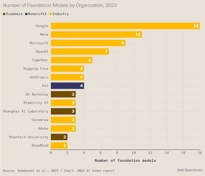 基礎(chǔ)模型是大型的多模態(tài)模型,例如OpenAI的GPT-3和GPT-4是使 ChatGPT用戶能夠編寫代碼或莎士比亞十四行詩(shī)的基礎(chǔ)模型。由于訓(xùn)練這些模型通常需要大量資源,因此工業(yè)界現(xiàn)在制作了大部分模型,而學(xué)術(shù)界只推出了少數(shù)模型。公司發(fā)布基礎(chǔ)模型既是為了推動(dòng)最先進(jìn)的技術(shù)向前發(fā)展,也是為了給開發(fā)人員提供構(gòu)建產(chǎn)品和服務(wù)的基礎(chǔ),其中谷歌在2023年發(fā)布最多。