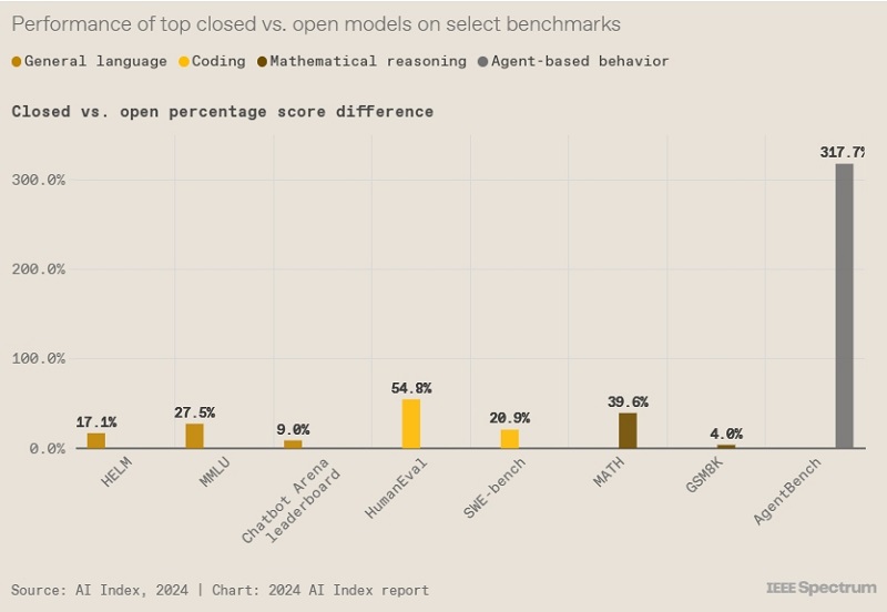 目前人工智能領(lǐng)域的熱門爭(zhēng)論之一是基礎(chǔ)模型應(yīng)該是開放還是封閉的,一些人熱衷認(rèn)為開放模型是危險(xiǎn)的,而另一些人則認(rèn)為開放模型推動(dòng)了創(chuàng)新。在許多常用的基準(zhǔn)測(cè)試中,封閉模型的表現(xiàn)優(yōu)于開放模型。關(guān)于開放與封閉的爭(zhēng)論通常圍繞著風(fēng)險(xiǎn)問題,但關(guān)于是否存在有意義的性能權(quán)衡的討論較少。