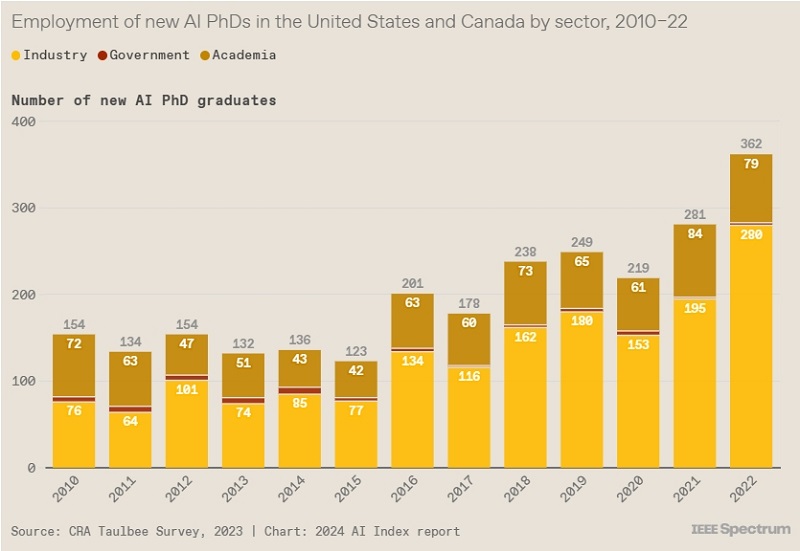 2022年美國(guó)有70名新的人工智能專業(yè)的博士在業(yè)界工作,這是過去幾年趨勢(shì)的延續(xù)。