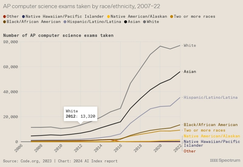 參加AP計(jì)算機(jī)科學(xué)考試的非白人和女學(xué)生人數(shù)正在增加,其中參加考試的學(xué)生有30%是女孩。在本科階段,獲得計(jì)算機(jī)科學(xué)學(xué)士學(xué)位的北美學(xué)生的種族多樣性也呈上升趨勢(shì),盡管獲得計(jì)算機(jī)科學(xué)學(xué)士學(xué)位的女性人數(shù)在過去五年中幾乎沒有變化。