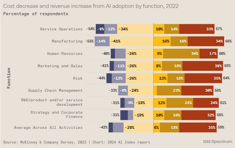 這就是為什么AI不僅僅是一個(gè)企業(yè)流行語(yǔ):麥肯錫的同一項(xiàng)調(diào)查顯示,AI的整合導(dǎo)致公司的成本下降、收入增加??傮w而言,42%的受訪者表示他們看到了成本的降低,59%的受訪者聲稱收入增加了。報(bào)告中的其他圖表表明,這種對(duì)底線的影響反映了效率的提高和工人生產(chǎn)力的提高。2023 年,不同領(lǐng)域的多項(xiàng)研究表明,AI使工人能夠更快地完成任務(wù)并產(chǎn)生更高質(zhì)量的工作。一項(xiàng)研究著眼于使用Copilot的編碼人員,而其他研究則著眼于顧問、呼叫中心代理和法學(xué)院學(xué)生。這些研究還表明,盡管每個(gè)工人都受益,但人工智能對(duì)低技能工人的幫助大于對(duì)高技能工人的幫助。